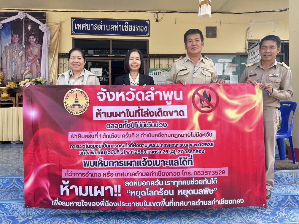 วันจันทร์ที่ 27 มกราคม 2568 เวลา 15.00 น. นางสาวพรรณี กันทะ นายกเทศมนตรีตำบลท่าเชียงทอง พร้อมด้วยคณะผู้บริหาร หัวหน้าส่วนราชการ หน่วยงานราชการในพื้นที่ กำนันตำบลบ้านแป้น และผู้นำชุมชนในพื้นที่ จัดกิจกรรม Kick Off และมอบป้ายประชาสัมพันธ์ห้ามเผาในที่โล่งเด็ดขาดตลอดทั้งปี ซึ่งเป็นนโยบายของผู้ว่าราชการจังหวัดลำพูน ณ สำนักงานเทศบาลตำบลท่าเชียงทอง อำเภอเมืองลำพูน จังหวัดลำพูน