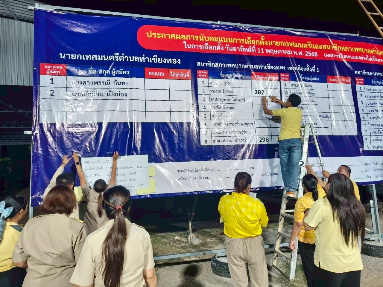 วันอาทิตย์ที่ 11 พฤษภาคม 2568 นายสุรศักดิ์ กัณทาซาว ผู้อำนวยการการเลือกตั้งประจำเทศบาลตำบลท่าเชียงทอง พร้อมด้วยคณะกรรมการการเลือกตั้งประจำเทศบาลตำบลท่าเชียงทองและเจ้าหน้าที่ผู้ปฏิบัติหน้าที่ช่วยเหลือในการเลือกตั้งฯ ดำเนินการรับมอบหีบบัตรเลือกตั้งและวัสดุอุปกรณ์ในการเลือกตั้ง และรวมผลการนับคะแนนการเลือกตั้งสมาชิกสภาเทศบาลและนายกเทศมนตรีตำบลท่าเชียงทอง
